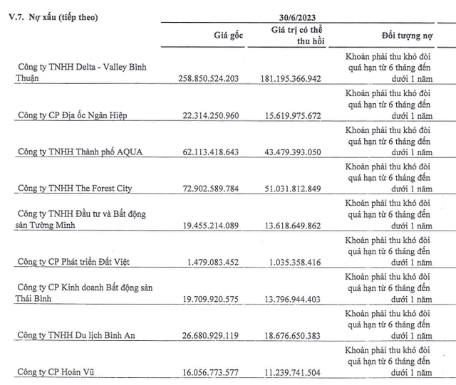 Dự phòng phải thu khách hàng đến ngày 30/9/2023 đã được trích lập 273 tỷ đồng. Trong đó, các khoản trích lập lớn nhất là BĐS Đà Lạt Valley (25 tỷ đồng) và Công ty TNHH Delta Valley Bình Thuận (77,6 tỷ).