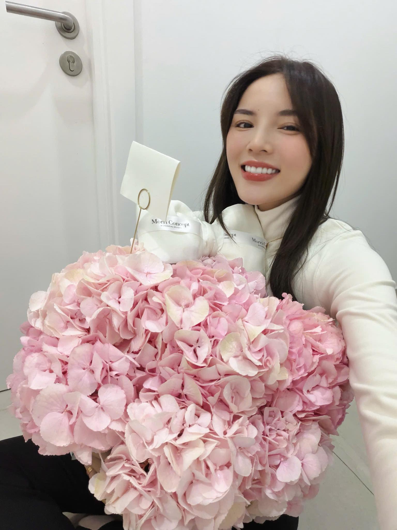 Người đẹp lập tức selfie cùng bó hoa hồng to tướng và không quên cảm ơn người tặng. Loạt ảnh này nhanh chóng hút hơn 11 nghìn lượt thích và hàng loạt bình luận.