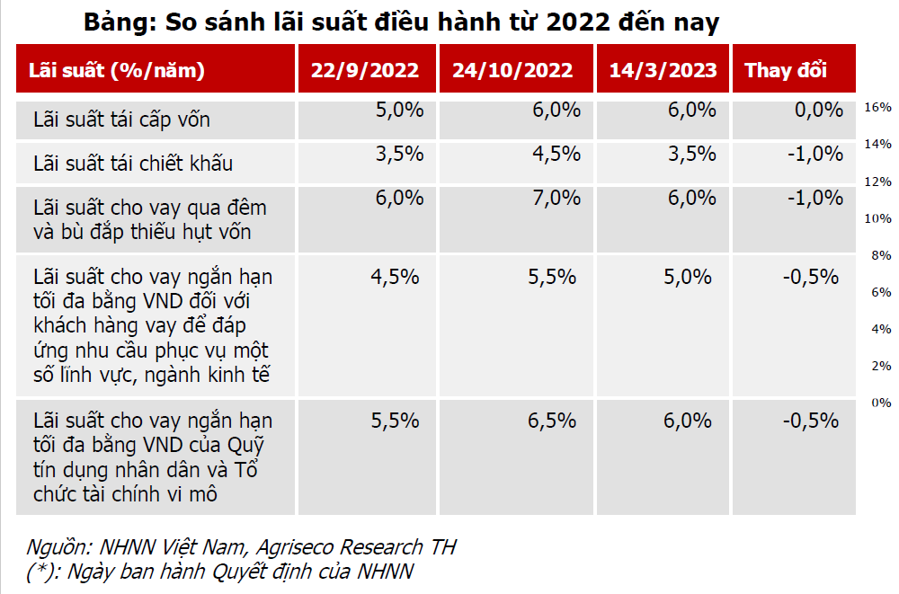 Agriseco Research đánh giá động thái NHNN giảm lãi suất là tín hiệu tích cực báo hiệu việc dừng thắt chặt tiền tệ. Từ giờ đến cuối năm dư địa giảm lãi suất vẫn còn khi mặt bằng lãi suất tỷ giá lạm phát đang ổn định nhưng không lớn do FED vẫn tiếp tục lộ trình tăng lãi suất và giữ lãi suất cao đến cuối năm. Lãi suất điều hành giảm kỳ vọng thúc đẩy các NHTM chủ động giảm lãi suất huy động từ đó hạ lãi suất cho vay giảm thiểu chi phí đầu vào cho doanh nghiệp hộ gia đình thúc đẩy các hoạt động sản xuất kinh doanh.