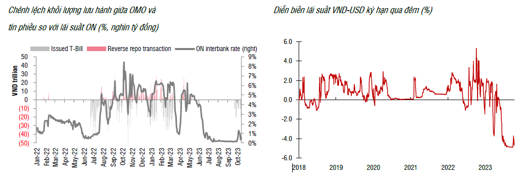 Tuần từ 09/10/2023-13/10, NHNN tiếp tục hoạt động phát hành tín phiếu xuyên suốt tuần trước, với tổng khối lượng phát hành là 65 nghìn tỷ đồng ở kỳ hạn 28 ngày, với phương thức đấu thầu là cạnh tranh lãi suất. Đáng chú ý, NHNN đã tăng cường độ hút tiền trong 2 phiên 12 và 13/10 lên trung bình 20 nghìn tỷ đồng/phiên, từ mức 10 nghìn tỷ đồng trước đó và nhờ vậy lãi suất trúng thầu sau khi giảm về 0,68% đã bật tăng lên 0,9%.