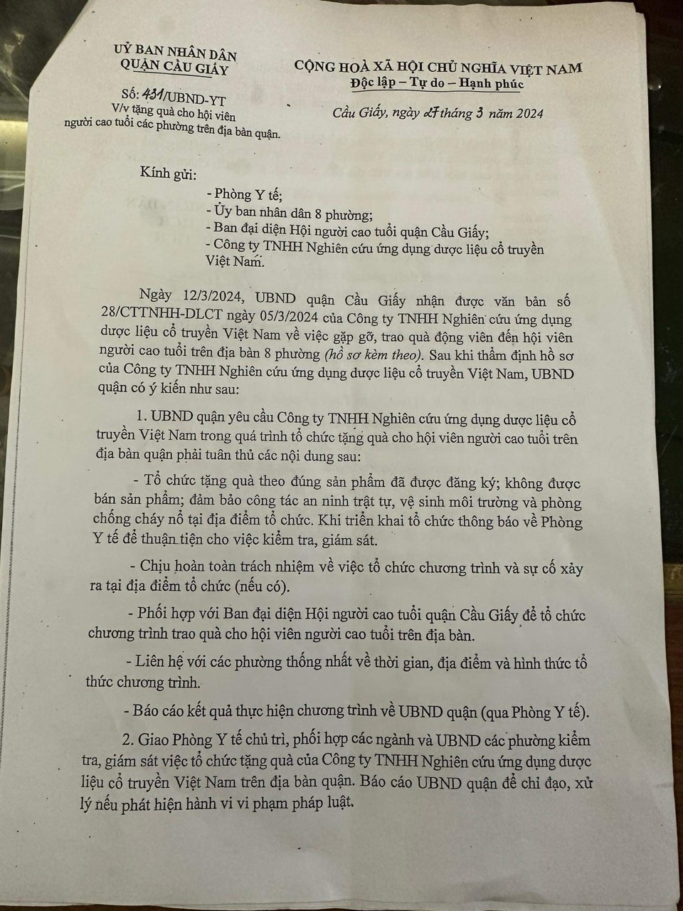 Được biết, ngày 27/3/2024, UBND quận Cầu Giấy đã kí công văn gửi Phòng y tế, UBND 8 phường, Ban Đại diện Hội người cao tuổi quận Cầu Giấy, Công ty TNHH nghiên cứu dược liệu cổ truyền Việt Nam chấp nhận cho công ty tặng quà cho hội viên người cao tuổi các phường trên địa bàn quận. Trong công văn ghi rõ công ty trong quá trình tặng quà cho hội viên người cao tuổi trên địa bàn quận tuân thủ nội dung tổ chức tặng quà theo đúng sản phẩm được đăng ký, không được bán sản phẩm…