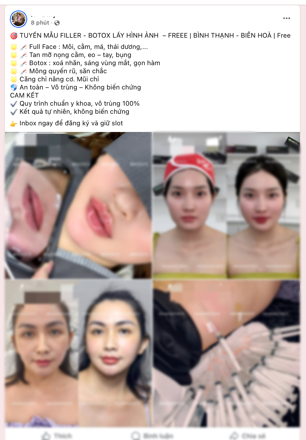 Trên các nền tảng mạng xã hội như Facebook, không khó để bắt gặp những lời mời gọi làm đẹp hấp dẫn từ các hội nhóm, bài viết tuyển mẫu tiêm filler, Botox hay thậm chí là mẫu tiểu phẫu như độn cằm, nâng mũi.