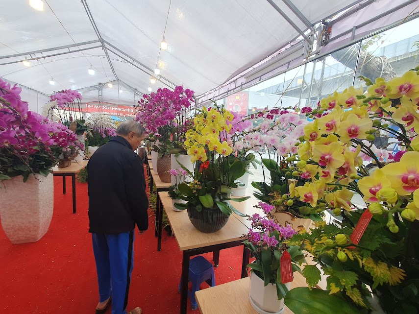 Khách hàng tham quan tại gian hàng bán lan Hồ điệp trên phố Nguyễn Trãi (Thanh Xuân) (Ảnh: Lộc Hà)