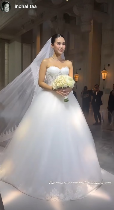 Xuất hiện trong đám cưới, cô dâu một lần nữa khiến nhiều người trầm trồ bởi vẻ ngoài sang chảnh khi diện đầm cưới bồng xòe như công chúa bước ra từ truyện cổ tích. Trong khi đó, chú rể gốc Dubai lịch lãm với suit trắng và quần âu đen. Cả hai được khen vô cùng xứng đôi.