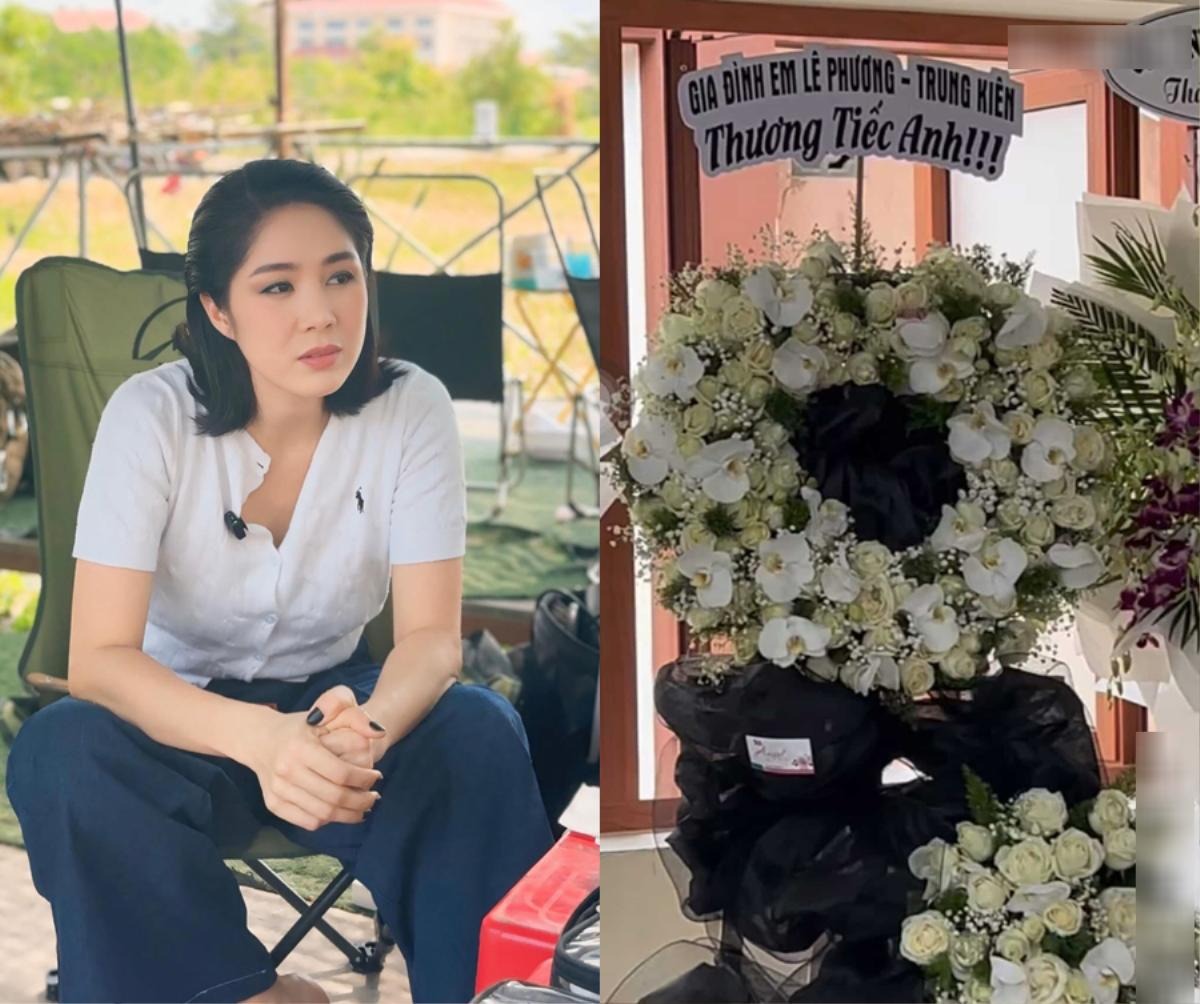 Trong đó, diễn viên Lê Phương đã gửi vòng hoa để tiễn biệt người anh từng có thời gian gắn bó thân thiết với cô. “Gia đình em Lê Phương - Trung Kiên. Thương tiếc anh”, dòng chữ đính kèm vòng hoa mà nữ diễn viên gửi đến tang lễ Quý Bình.
