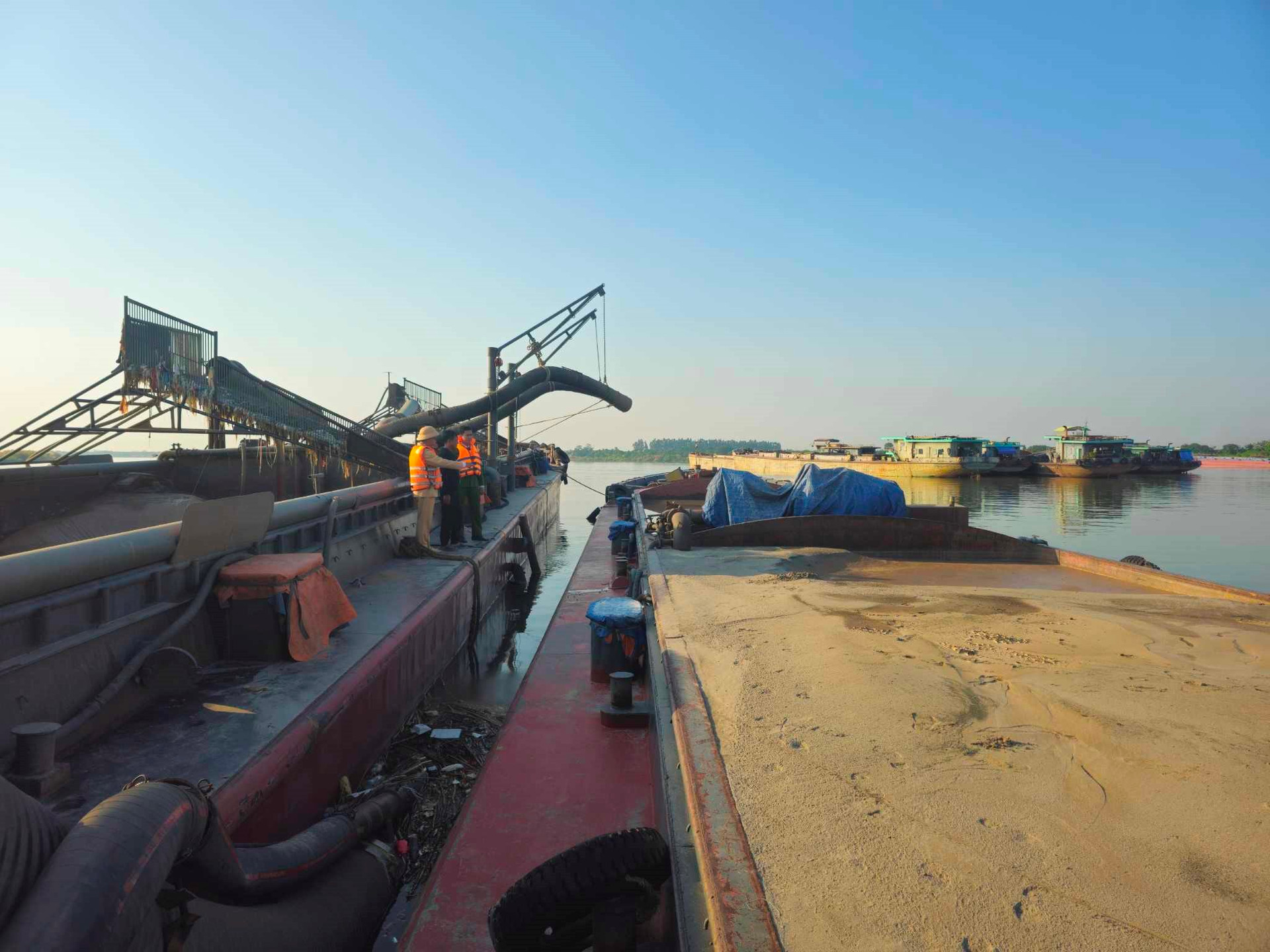 Trước đó, ngày 14/11, tại bờ trái sông Hồng thuộc địa phận xã Trung Châu, huyện Đan Phượng (Hà Nội), tổ công tác Đội Cảnh sát đường thủy số 1, Phòng Cảnh sát giao thông cùng Công an huyện Đan Phượng mật phục, phát hiện bắt giữ phương tiện thủy gắn số PT-2205 trên phương tiện có gắn các thiết bị khai thác cát đang tiến hành hút cát từ lòng sông Hồng bơm vào khoang hàng của phương tiện thủy VP-2588.