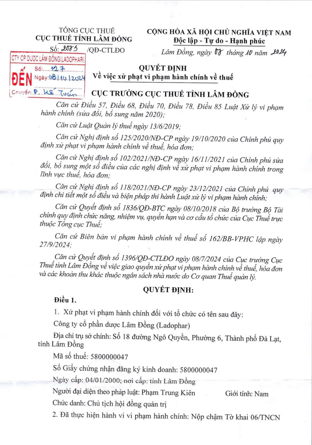 Theo Quyết định số 2073/QĐ-CTLĐO do bà Nguyễn Thị Tuyết Ánh, Phó Cục trưởng Cục thuế tỉnh Lâm Đồng ký vào ngày 7/10/2024, Dược Lâm Đồng bị xử phạt hành chính vì nộp chậm Tờ khai 06/TNCN, tờ khai khấu từ thuế thu nhập cá nhân (TNCN), kỳ kê khai tháng 6/2023 nộp chậm 6 ngày so với quy định.