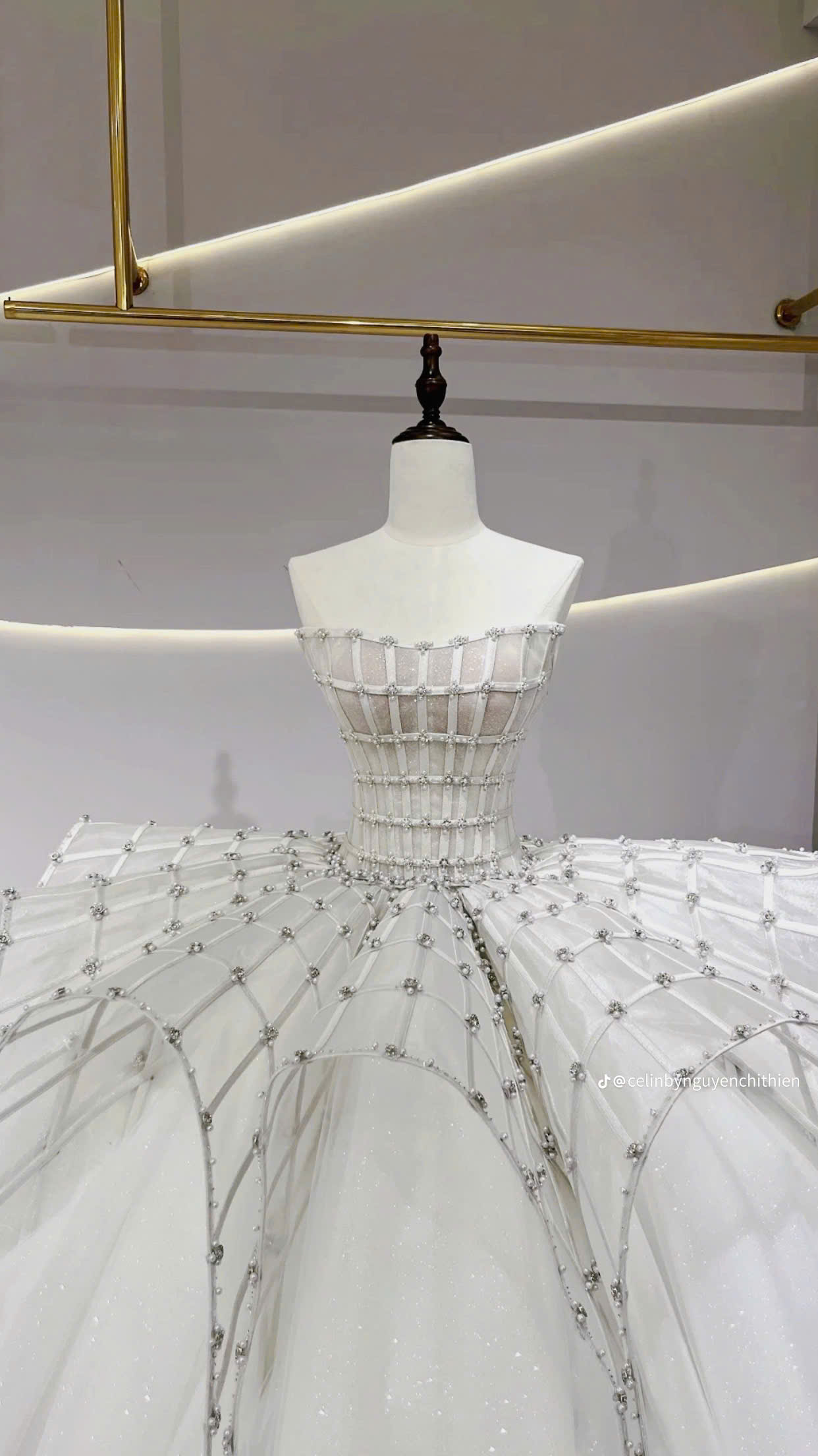 Mới đây, mạng xã hội rò rỉ khoảnh khắc ghi lại công đoạn hoàn thiện chiếc váy được cho chính là trang phục final walk đêm chung kết của Thanh Thủy. Theo đó, thiết kế siêu nặng có màu trắng với form dáng bồng xòe rộng, dài quét đất.