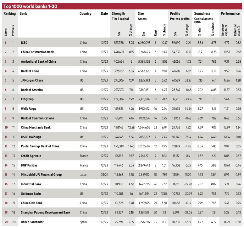 Trong bảng xếp hạng Top 20 ngân hàng lớn nhất thế giới của The Banker, các ngân hàng Trung Quốc góp mặt tròn một nửa (10 ngân hàng, bao gồm ICBC, Ngân hàng Nông nghiệp Trung Quốc, Bank of China, Bank of Communications, China Merchants Bank, Ngân hàng tiết kiệm bưu điện Trung Quốc, Ngân hàng Công thương, China Citic Bank, Ngân hàng Phát triển Phố Đông Thượng Hải), còn lại là 5 ngân hàng Mỹ (JPMorgan Chase, Bank of America, Citigroup, Wells Fargo, Goldman Sachs), 2 ngân hàng Pháp (Crédit Agricole, BNP Paribas), 1 ngân hàng Anh (HSBC), 1 ngân hàng Nhật Bản (Mitsubishi UFJ Financial Group) và 1 ngân hàng Tây Ban Nha (Banco Santander).