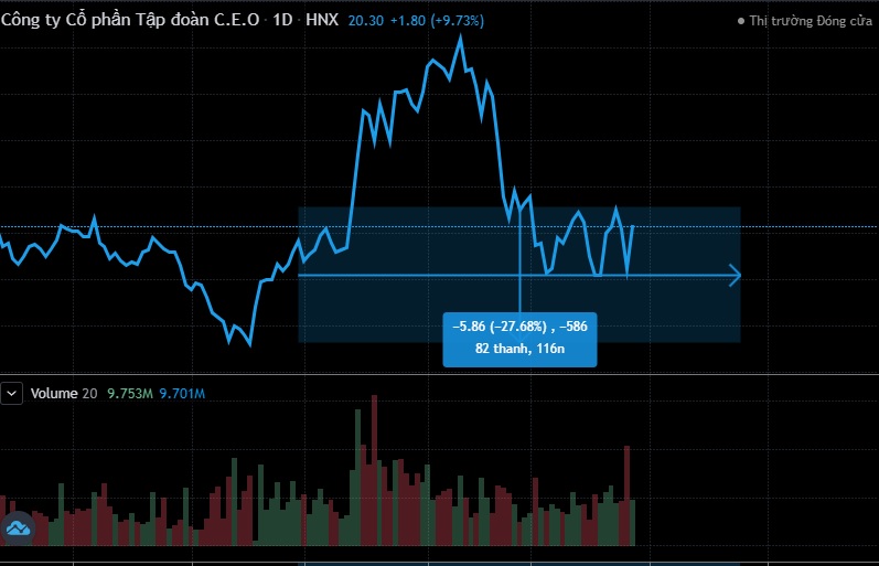 Cổ phiếu CEO đã tạo 3 đáy theo mô hình "W" ngay trong tháng 10. Theo biểu đồ kỹ thuật, đáy 1 được hình thành ngày 6/10, sau tuần tăng ngắn hạn rồi lại giảm và tạo đáy 2 vào ngày 19/10. Cổ phiếu CEO tiếp tục có diễn biến giá "như sách" khi tăng liên tiếp 3 phiên. Đến phiên thứ 4 áp lực chốt lời tăng cao, cổ phiếu CEO lại giảm giá.