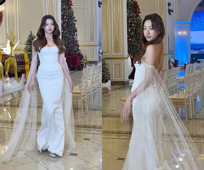 Miss World Vietnam 2019 diện chiếc trắng ôm dáng tinh tế, với điểm nhấn là tà bay tạo cảm giác mềm mại, thướt tha khi di chuyển.