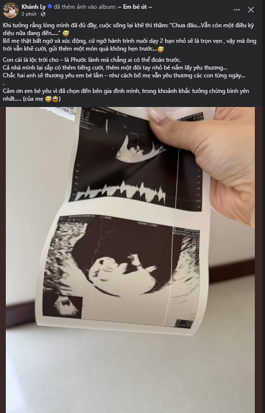 Mới đây trên trang cá nhân, Ly Kute vừa có bài đăng gây chú ý. Khoe ảnh trên tay cầm giấy siêu âm thai nhi, hot mom trải lòng: "Khi tưởng rằng lòng mình đã đủ đầy, cuộc sống lại khẽ thì thầm: 'Chưa đâu…Vẫn còn một điều kỳ diệu nữa đang đến…..'