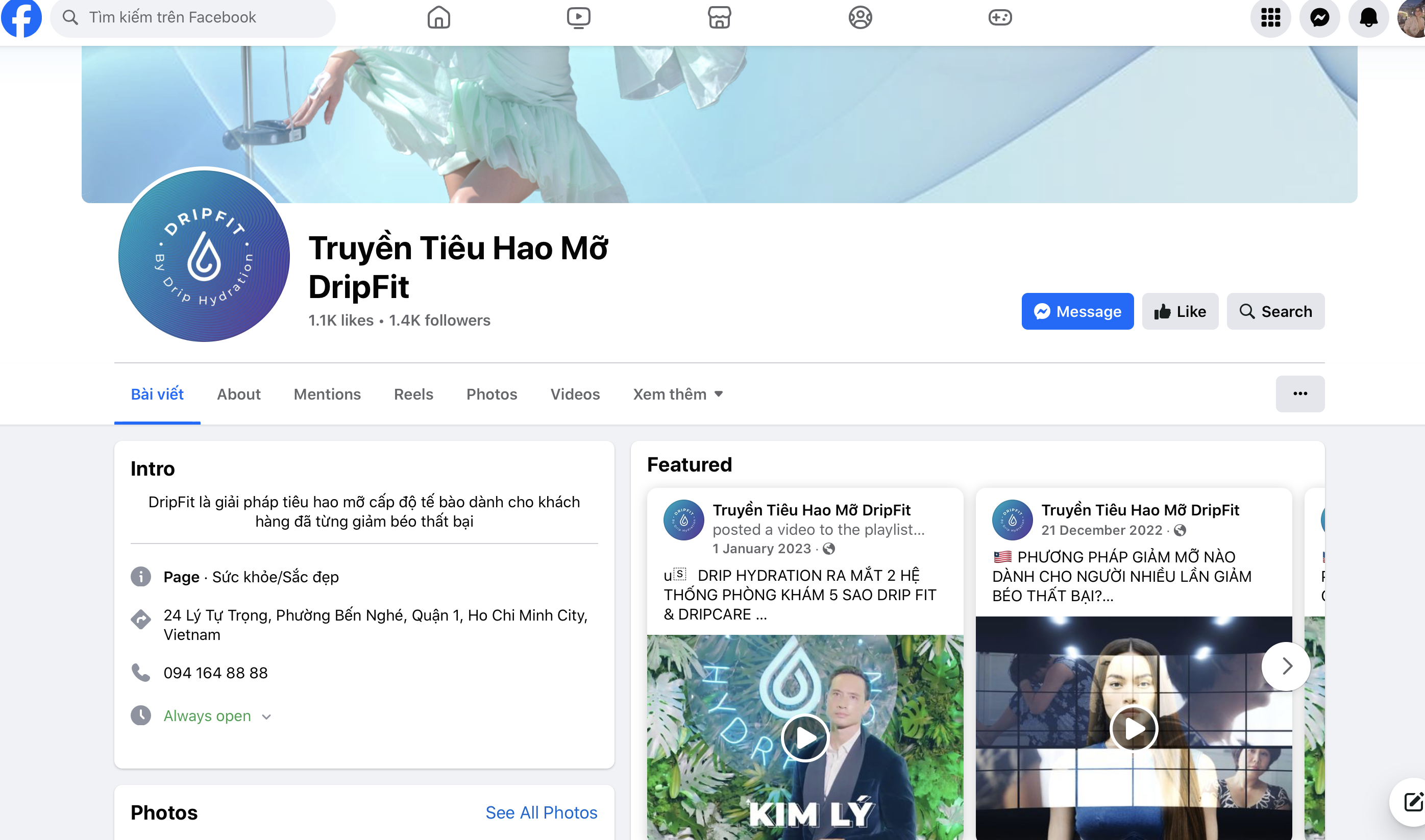 Tương tự, tại trang facebook có tên “Phòng khám giảm béo chuẩn y khoa Drip Fit” cũng đăng tải hàng loạt video quảng cáo về công nghệ giảm béo. Theo trang này quảng cáo, Phòng khám đa khoa Drip Hydration Việt Nam tại địa chỉ 24 Lý Tự Trọng, phường Bến Nghé, Quận 1, đây là thương hiệu được vinh danh Inspirational Brand Award - Thương hiệu truyền cảm hứng Châu Á 2023. Đây là giải thưởng quan trọng trong các hạng mục giải thưởng của APEA, đối với thương hiệu có tầm ảnh hưởng tích cực đến cộng đồng được người tiêu dùng tin cậy và lựa chọn.