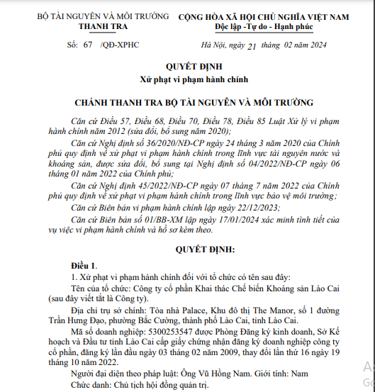 Chánh thanh tra Bộ Tài nguyên môi trường vừa ban hành quyết định số 67/QĐ-XPHC về việc xử phạt vi phạm hành chính đối với Công ty cổ phần Khai thác Chế biến Khoáng sản Lào Cai.