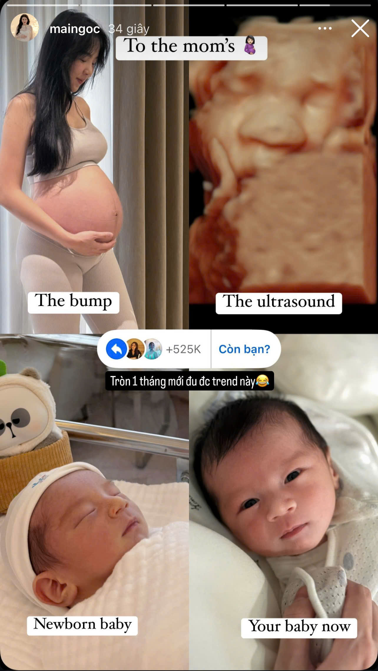 Mai Ngọc đăng hình kèm dòng trạng thái: "Tròn 1 tháng mới được đu trend này". Trong story, MC Mai Ngọc chia sẻ 4 bức hình từ khi mang thai, ảnh siêu âm của con tới khi nhóc tỳ chào đời và sau sinh 1 tháng.