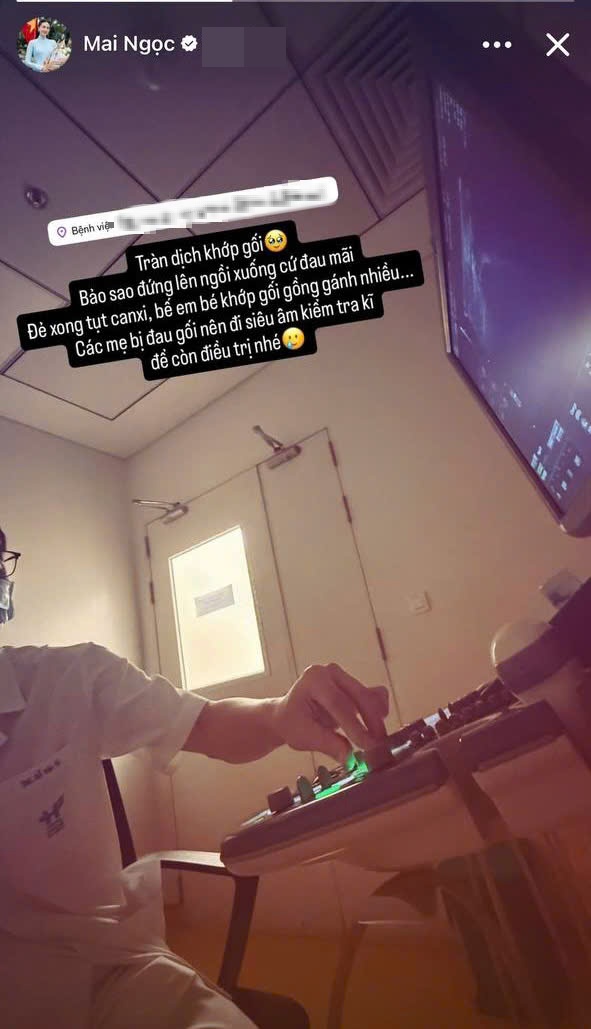 Theo đó, trên trang cá nhân, người đẹp chia sẻ bức hình nằm trong viện kèm dòng trạng thái: "Tràn dịch khớp gối, bảo sao đứng lên ngồi xuống cứ đau mãi. Đẻ xong tụt canxi, bế em bé khớp gối gồng gánh nhiều. Các mẹ bị đau gối nên đi siêu âm kiểm tra kĩ để còn điều trị nhé."