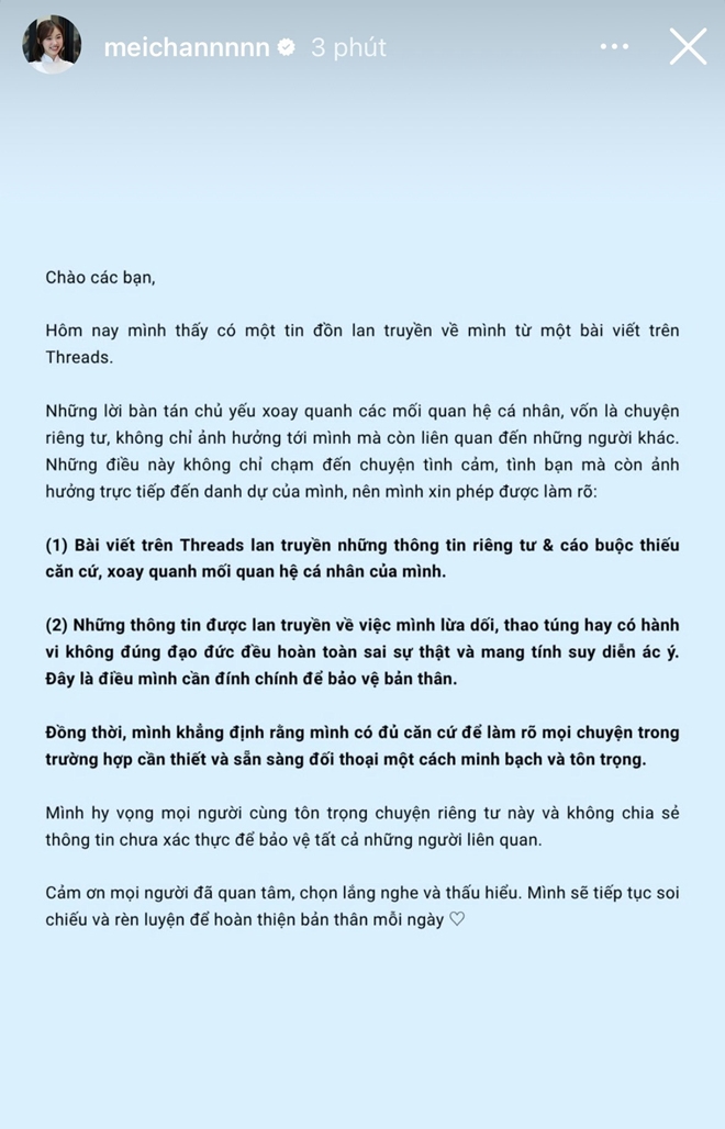 Trước làn sóng bình luận trái chiều, Meichan đã chính thức lên tiếng phản hồi trên trang cá nhân: