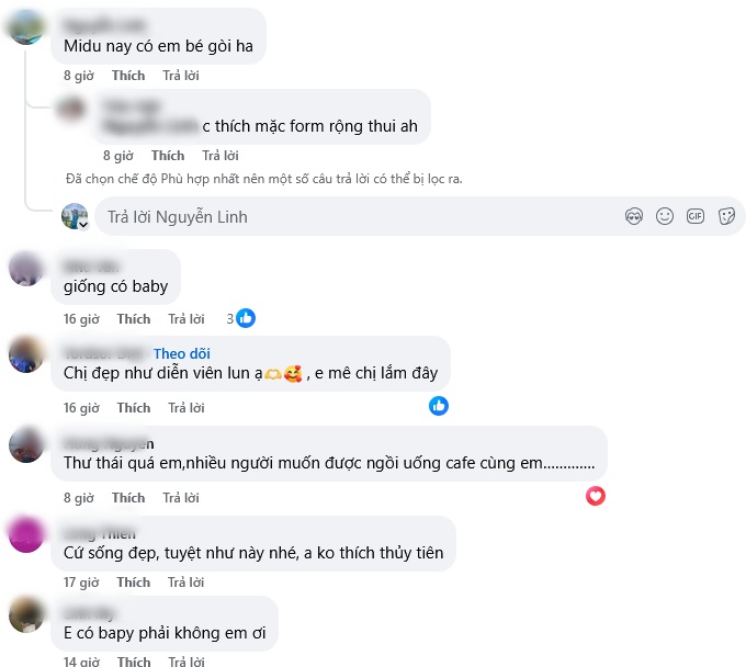 Dưới bài đăng, nhiều người để lại bình luận thắc mắc: "Midu có em bé rồi ha?", "Giống có baby", "Em có baby phải không?"...