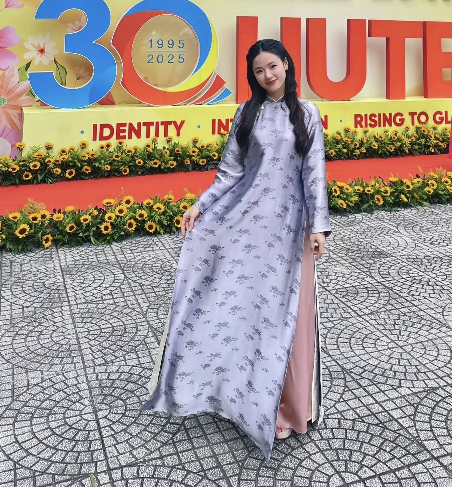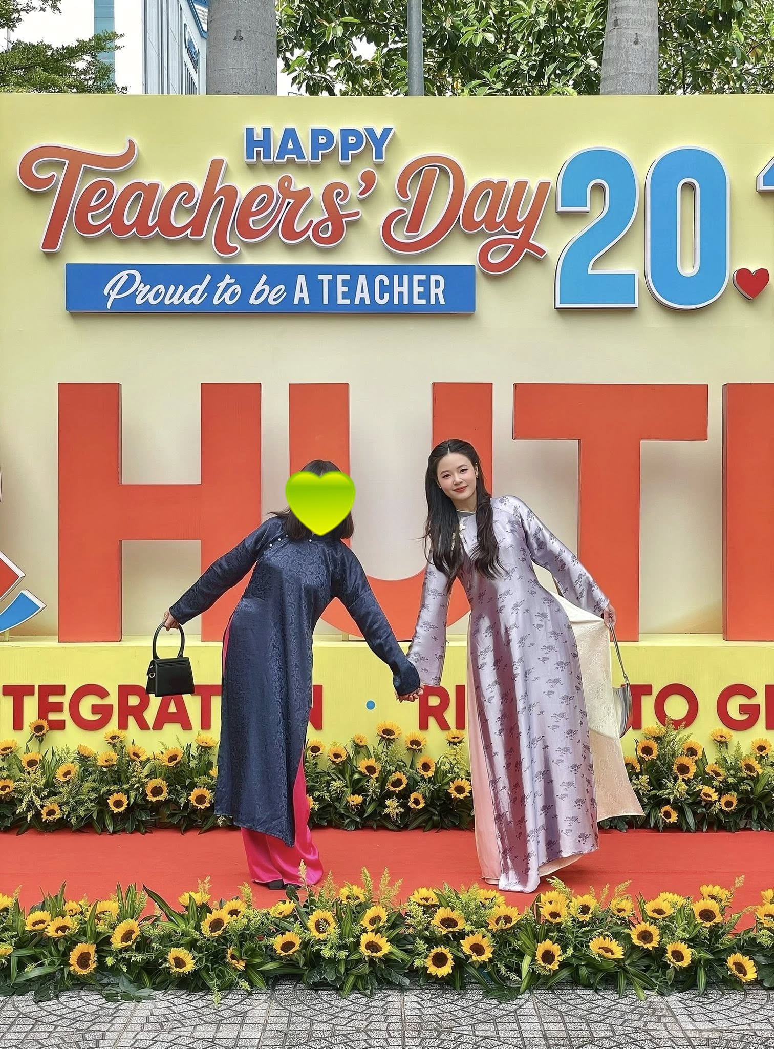 Trong sự kiện hồi tháng 10, nàng dâu hào môn gây chú ý khi diện áo dài màu xanh, trang điểm nhẹ nhàng và tay liên tục xoa bụng.