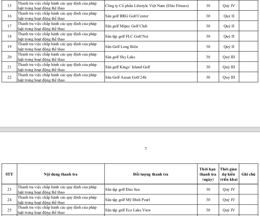 Đến quý III, các sân golf Sky Lake, Kings’ Island Golf, Asean Golf 24h sẽ được thanh tra. Trong quý IV/2025, các sân tập golf Đảo Sen, Mỹ Đình Pearl và Eco Lake View sẽ được kiểm tra.