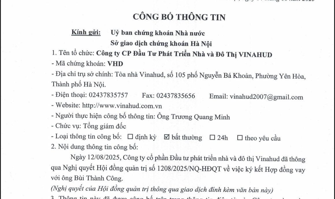 Ngày 12/8/2025, HĐQT CTCP Đầu tư Phát triển Nhà và Đô thị VINAHUD (UPCoM:VHD) đã thông qua nghị quyết ký hợp đồng vay với ông Bùi Thành Công với số tiền vay hơn 906,5 tỷ đồng.