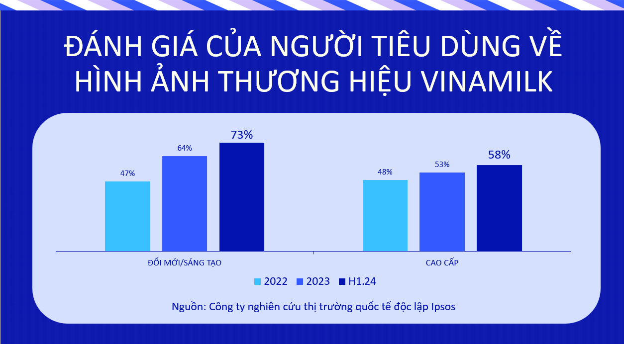 Theo khảo sát do Ipsos – công ty nghiên cứu thị trường lớn thứ 3 thế giới, có trụ sở chính tại Pháp, 73% người tiêu dùng nhận xét thương hiệu Vinamilk mang tính đổi mới và sáng tạo, trong khi 58% đánh giá cao tính cao cấp của thương hiệu. Cả hai chỉ số quan trọng này đều tăng đáng kể so với giai đoạn trước tái định vị.