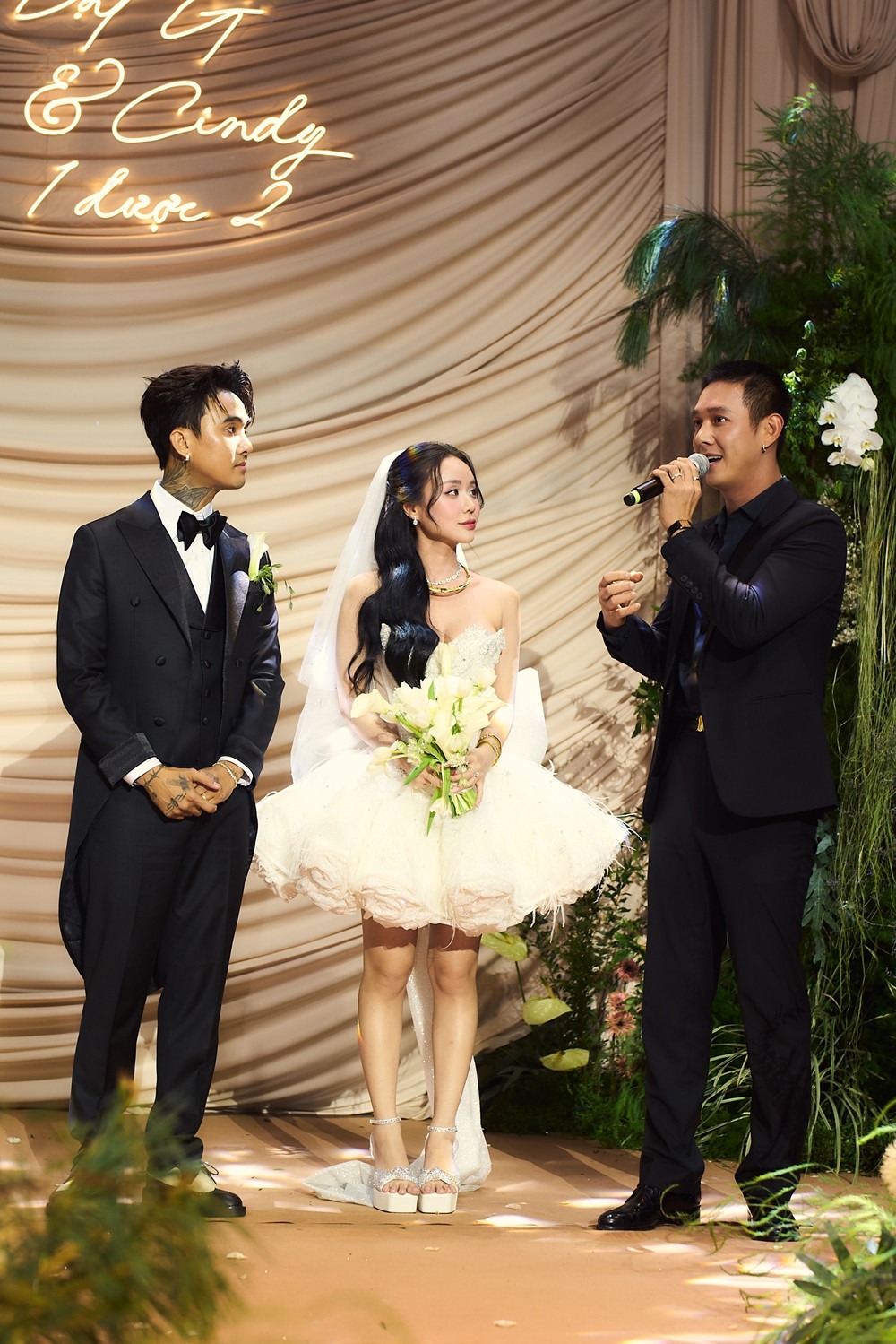 Trong ngày trọng đại, Đạt G diện vest trắng, còn cô dâu Cindy Lư mặc váy cúp ngực đính đá. Cả hai diện trang phục đồng điệu, toát lên sự thanh lịch.