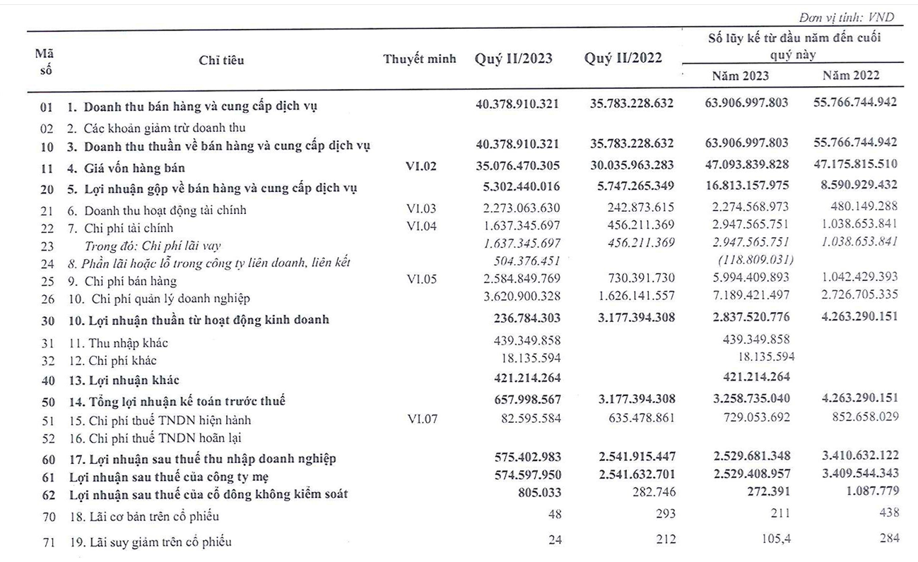 Về tình hình kinh doanh, lũy kế 6 tháng đầu năm 2023, công ty ghi nhận doanh thu thuần đạt 63,9 tỷ đồng tăng 35% so với cùng kỳ. Tuy nhiên, lợi nhuận sau thuế đạt 2,5 tỷ đồng - giảm 26% so với cùng kỳ. Nguyên nhân là do chi phí lãi vay tăng gần gấp 3 lần lên hơn 2,9 tỷ đồng. Các chi phí bán hàng và quản lý doanh nghiệp cũng tăng mạnh lên gần 6 tỷ đồng và 7,1 tỷ đồng.