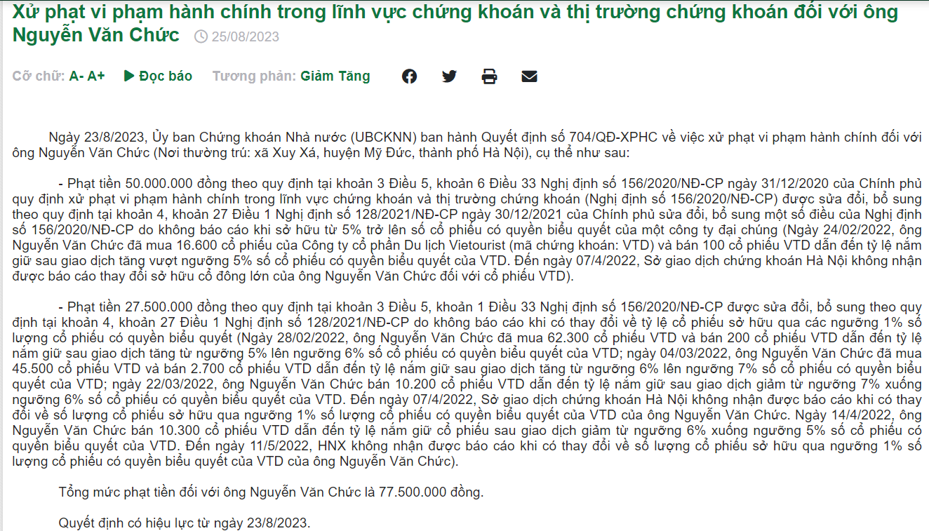 UBCKNN cho biết ngày 24/02/2022, ông Nguyễn Văn Chức đã mua 16.600 cổ phiếu của Công ty cổ phần Du lịch Vietourist (mã VTD-UPCoM) và bán 100 cổ phiếu VTD dẫn đến tỷ lệ nắm giữ sau giao dịch tăng vượt ngưỡng 5% số cổ phiếu có quyền biểu quyết của VTD. Đến ngày 07/4/2022, HNX không nhận được báo cáo thay đổi sở hữu cổ đông lớn của ông Nguyễn Văn Chức đối với cổ phiếu VTD.