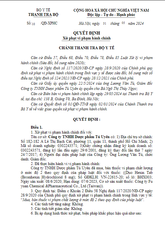 Thanh tra Bộ Y tế xác định Công ty TNHH Dược phẩm Tú Uyên đã có hành vi mua, bán thuốc vi phạm chất lượng ở mức độ 2 theo quy định của pháp luật đối với thuốc: ((Duo Hexin Tab (Bromhexin Hydrochlorid 8 mg); Số GĐKLH: VN-22615-20; số lô: BHX003; Ngày sản xuất: 08/6/2020; Hạn dùng: 07/6/2023, Cơ sở sản xuất thuốc: Công ty Fu yuan Chemical & Pharmaceutical Co., Ltd (Taiwan)).