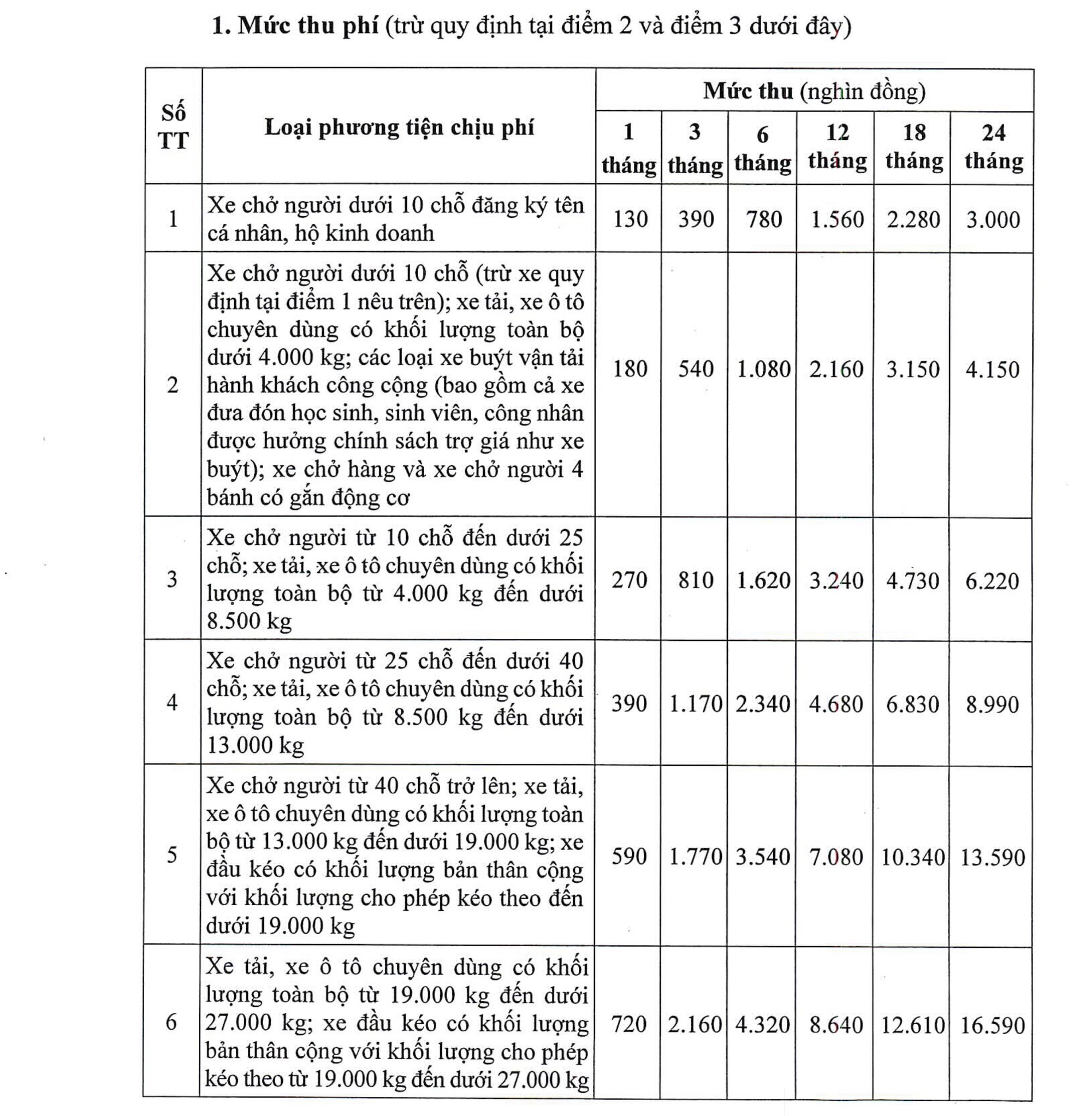 Thời gian tính phí theo Biểu nêu trên tính từ khi đăng kiểm xe, không bao gồm thời gian của chu kỳ đăng kiểm trước. Trường hợp chủ phương tiện chưa nộp phí của chu kỳ trước thì phải nộp bổ sung tiền phí của chu kỳ trước, số tiền phải nộp = Mức thu 01 tháng x số tháng phải nộp của chu kỳ trước.