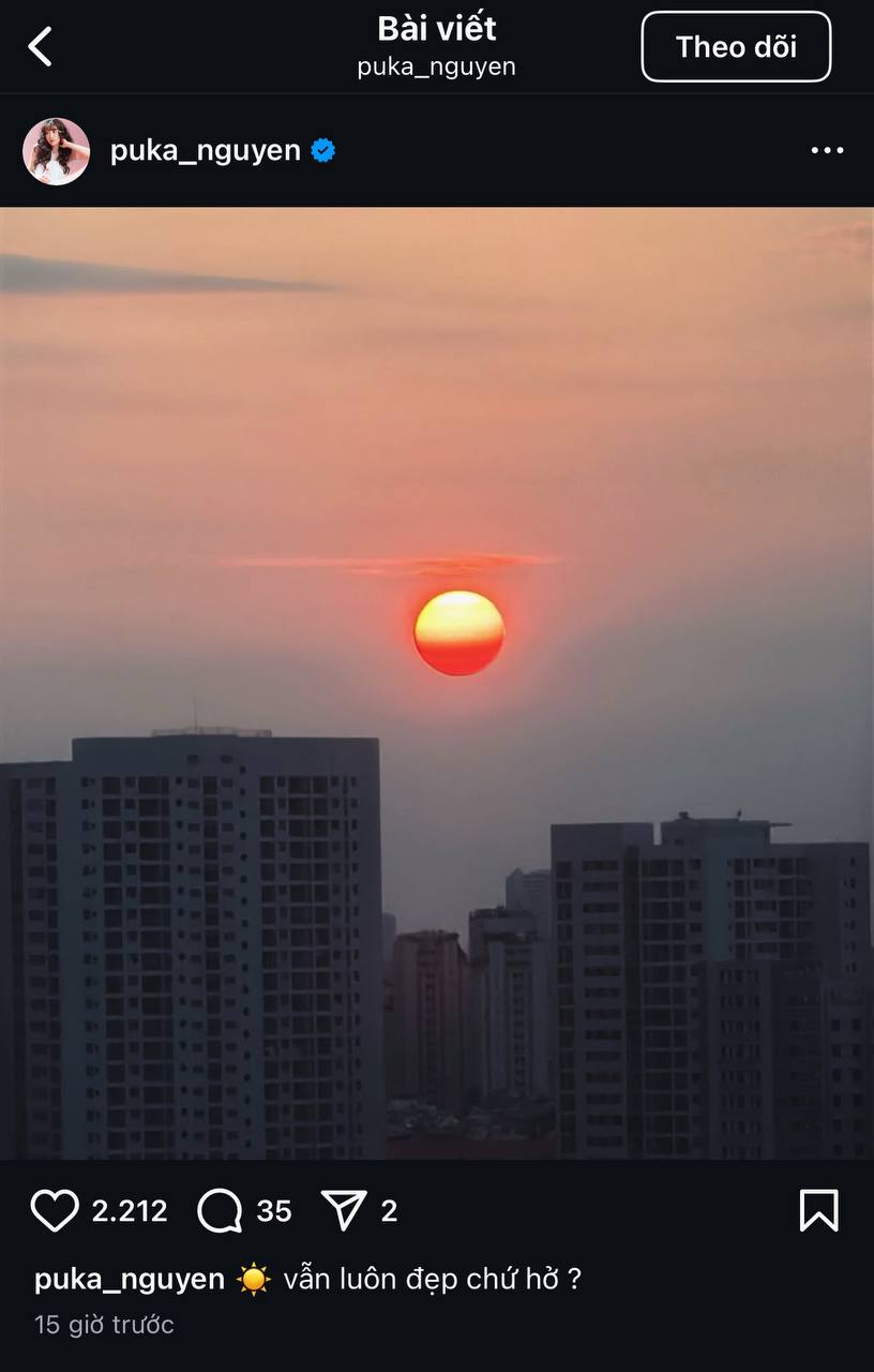 Chưa hết, trên trang cá nhân, Puka không cập nhật những hình ảnh liên quan đến công việc mà lại chia sẻ bức ảnh hoàng hôn kèm dòng trạng thái: "Mặt trời vẫn luôn đẹp chứ hở?"