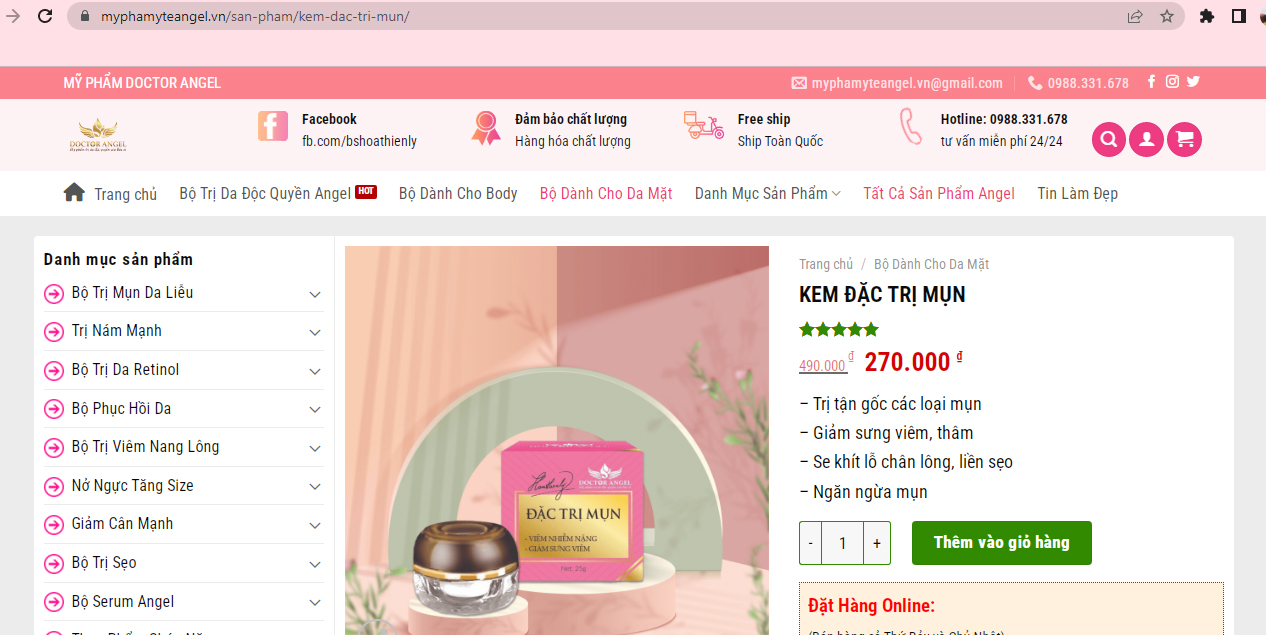 Từ phản ánh của người tiêu dùng, PV Thương Trường đã tìm hiểu một số website kinh doanh về mỹ phẩm, đơn cử như trang web https://myphamyteangel.vn/, PV nhận thấy không khó để đặt mua các sản phẩm mỹ phẩm kem trị mụn, serum trị mụn, trị thâm nám, tái tạo da…