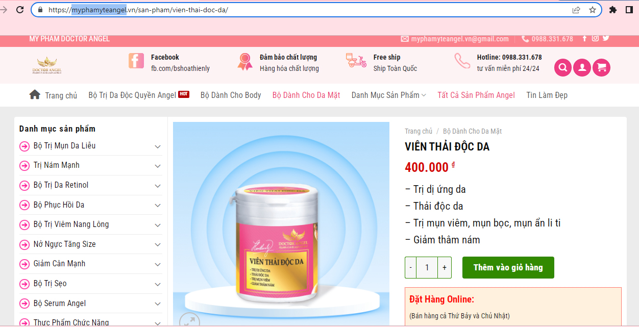 Cụ thể, với sản phẩm Viên thải độc da, cơ sở này ngang nhiên giới thiệu rằng: “sử dụng sản phẩm thuốc thải độc da Angel, bạn sẽ an tâm có một làn da đẹp, trắng sáng mà không bị tổn hại sức khỏe và tiền bạc”. Không những vậy, Viên thải độc da này còn được quảng cáo có công dụng “Trị dị ứng da; Thải độc da; Trị mụn viêm, mụn bọc, mụn ẩn li ti; Giảm thâm nám”.