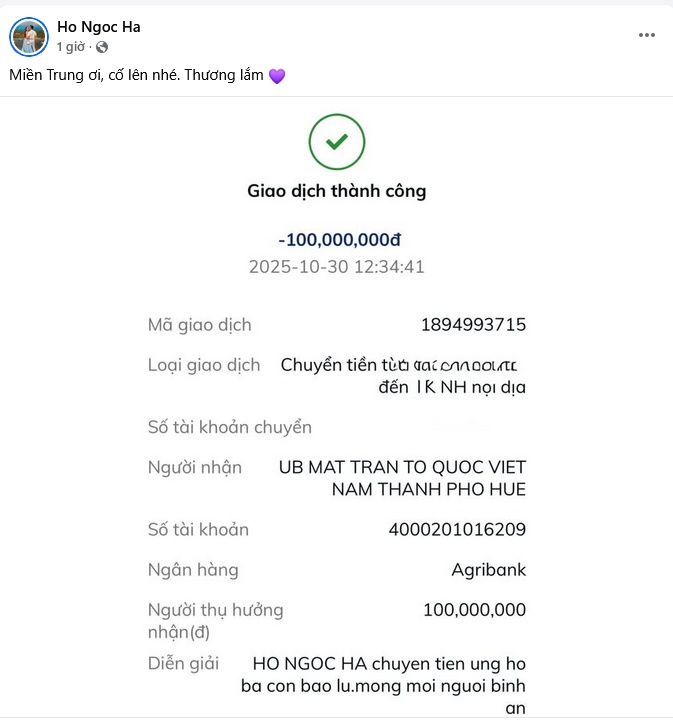 Kèm theo đó, giọng ca "Cây Đàn Sinh Viên" chia sẻ màn hình chuyển khoản 100 triệu đồng gửi bà con chịu ảnh hưởng bão lũ ở Huế. Người đẹp cũng tiết lộ muốn cứu trợ bà con ở Quang Nam, Đà Nẵng mà chưa có thông tin để chuyển tiền.