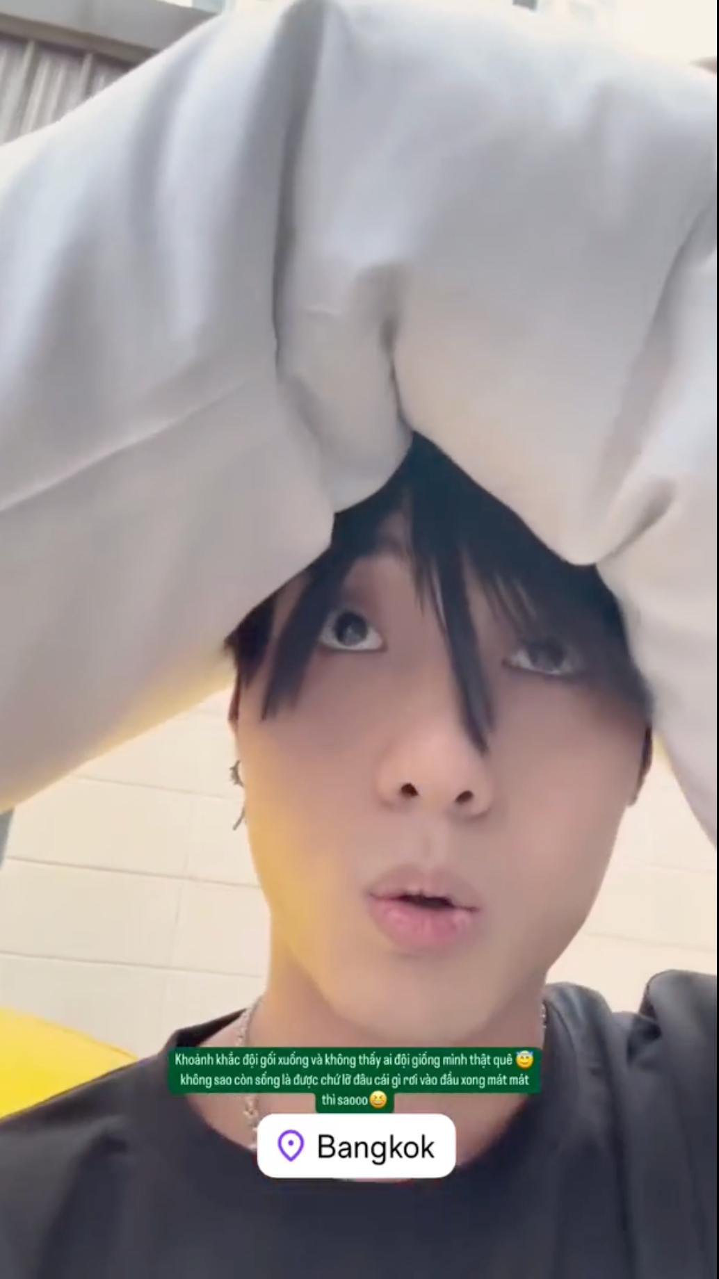 Nam ca sĩ cho biết khi di chuyển có rất nhiều đá rơi từ trên tường xuống nên mới lấy cái gối để bảo vệ phần đầu.