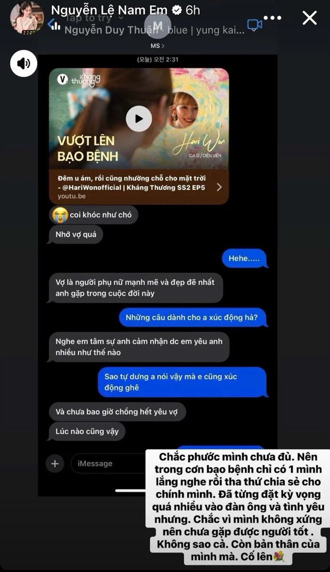 Cụ thể, Nam Em xúc động viết: "Chắc phước mình chưa đủ. Nên trong cơn bạo bệnh chỉ có một mình lắng nghe rồi tha thứ, chia sẻ cho chính mình. Đã từng đặt kỳ vọng quá nhiều vào đàn ông và tình yêu nhưng chắc vì mình không xứng nên chưa gặp được người tốt. Không sao cả. Còn bản thân của mình mà. Cố lên."