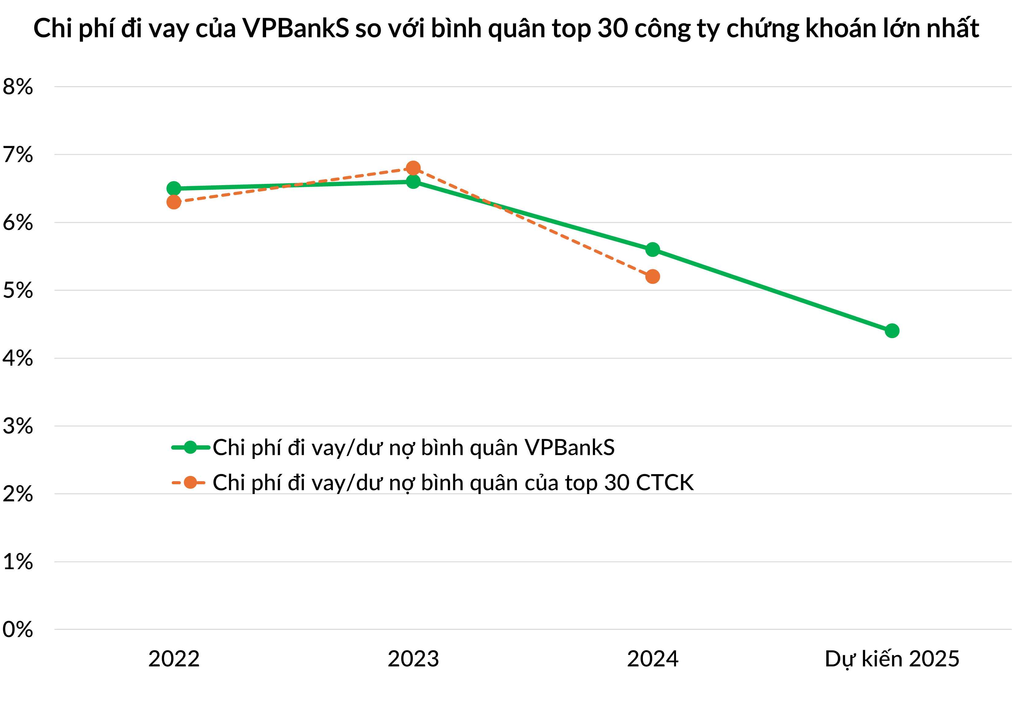 Nhờ chiến lược huy động đa dạng, dự kiến trong năm 2025, chi phí đi vay bình quân của VPBankS thấp hơn khoảng 100-150 điểm cơ bản so với bình quân của top 30 công ty chứng khoán lớn nhất.