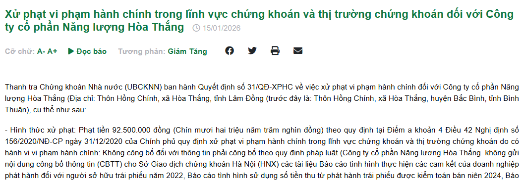 Ngày 15/01/2026, Thanh tra Chứng khoán Nhà nước (UBCKNN) ban hành Quyết định số 31/QĐ-XPHC xử phạt vi phạm hành chính đối với CTCP Năng lượng Hòa Thắng với số tiền 92,5 triệu đồng. Mức phạt được áp dụng theo quy định tại Điểm a Khoản 4 Điều 42 Nghị định 156/2020/NĐ-CP, do doanh nghiệp không thực hiện đầy đủ nghĩa vụ công bố thông tin theo quy định của pháp luật chứng khoán.