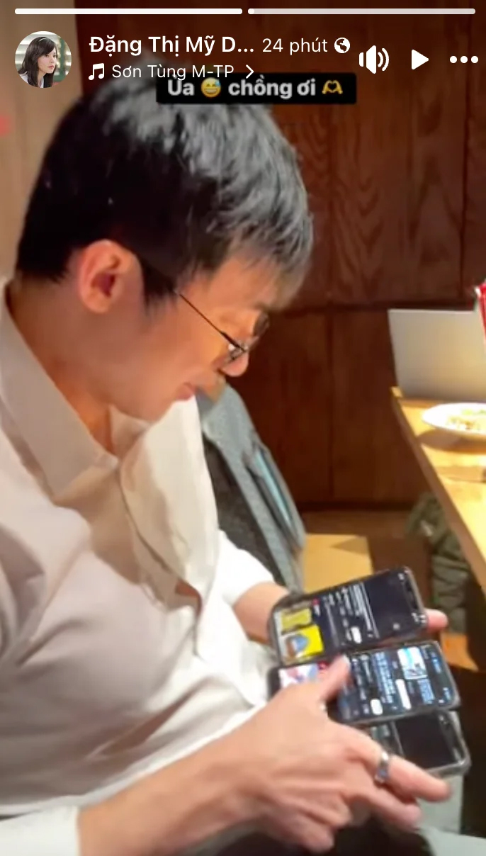 Từ hình ảnh cho thấy người đẹp SN 1989 bắt gặp chồng đang ngồi trong phòng, cầm đến ba chiếc điện thoại để "cày view" cho vợ. Khi biết vợ đang ghi hình, Minh Đạt chỉ biết cười ngại ngùng, khuôn mặt hiện rõ sự bối rối.