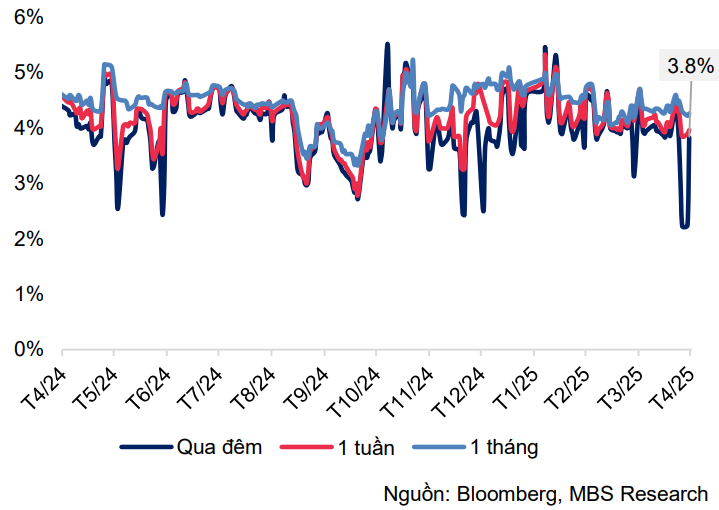 Mặc những động thái hút ròng của Nhà điều hành, lãi suất liên ngân hàng kỳ hạn qua đêm sau khi duy trì quanh ngưỡng 4% - 4.4% trong nửa đầu tháng 4, đã giảm mạnh về mức đáy 13 tháng tại 2.2% vào ngày 25/4 – cho thấy tình trạng dư thừa của thanh khoản hệ thống.