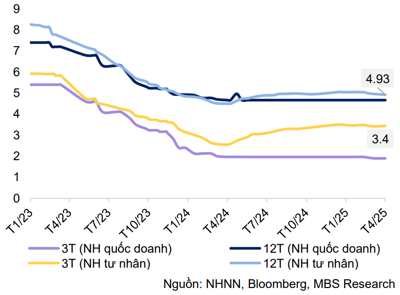 Chuyên gia tại MBS cũng đưa ra dự báo rằng tăng trưởng tín dụng trong năm nay sẽ đạt 17 – 18%, được thúc đẩy bởi: sự phục hồi của ngành sản xuất và tiêu dùng nội địa, và việc đẩy mạnh giải ngân vốn đầu tư công. Dựa vào các yếu tố trên, chúng tôi dự báo lãi suất huy động kỳ hạn 12 tháng của các NHTM lớn sẽ dao động quanh mức 5.5% - 6% trong năm 2025.