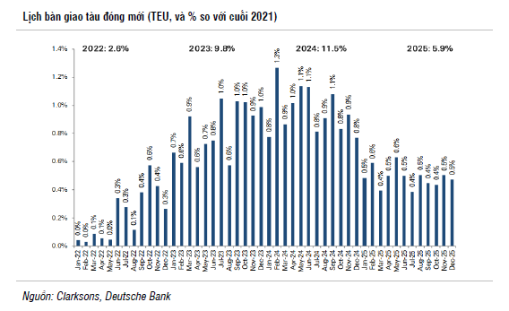 Theo Clarksons, tổng khối lượng đặt đóng mới chiếm đến 26,3% đội tàu hiện có, trong đó 9% ước tính sẽ được bàn giao trong năm 2023 và 16,3% còn lại kể từ năm 2024 trở đi. Ngoài ra, lượng cung tàu được giải phóng khi tình trạng tắc nghẽn cảng được giải quyết có thể tạo thêm áp lực dư cung cho thị trường vận tải. Mặt khác, hai quy định mới của IMO về giảm thải carbon từ tàu biển (Chỉ số hiệu quả năng lượng đối với tàu hiện có - EEXI, và Chỉ số nồng độ carbon - CII) có hiệu lực từ năm 2023 sẽ giúp giảm khoảng 5% lượng cung tàu khi nhiều tàu buộc phải giảm tốc độ vận hành.
