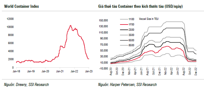 Thị trường vận tải container đã kết thúc chu kỳ tăng và bước vào giai đoạn điều chỉnh. SSI Research cho rằng các công ty vận tải container và logistics sẽ chịu ảnh hưởng nhiều nhất do nhu cầu yếu và nguồn cung tăng, tuy nhiên sản lượng kỳ vọng có thể phục hồi vào nửa cuối năm 2023 khi nhu cầu tăng trở lại.