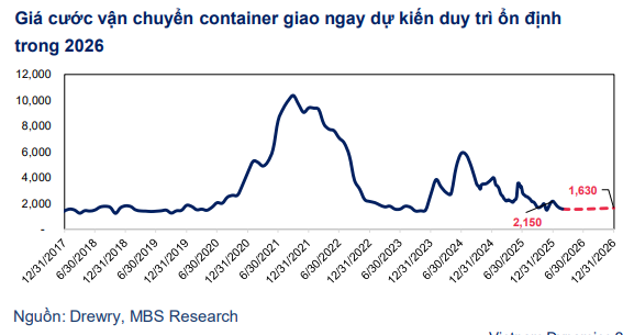 Báo cáo của MBS cho thấy năm 2026 đánh dấu sự chuyển pha quan trọng của thị trường logistics toàn cầu. Tính đến hết tháng 11/2025, giá cước vận chuyển container đã giảm 54% so với vùng đỉnh tháng 1/2025, trở về mức tương tự như trước khủng hoảng Biển Đỏ, sau khi các yếu tố hỗ trợ như front-loading đã kéo tăng giá cước vận chuyển container đến giữa năm 2025. MBS kỳ vọng giá cước vận chuyển container sẽ tiếp tục hạ nhiệt và duy trì ổn định trong năm 2026 quanh 1.630 USD/40ft container.
