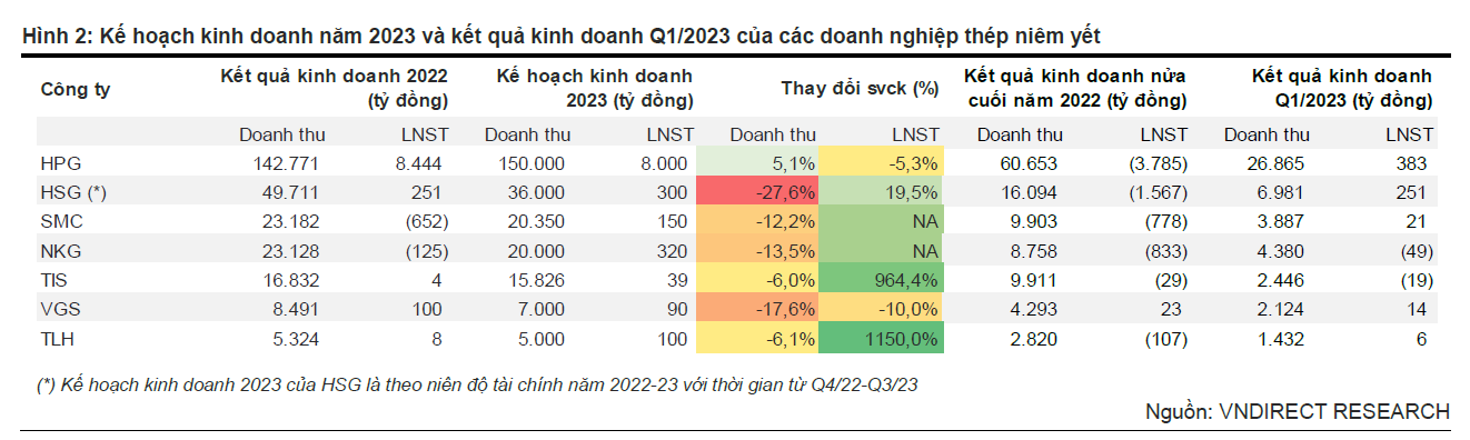 VnDirect cho rằng xu hướng này đến chủ yếu bởi tổng sản lượng tiêu thụ thép (bao gồm thép xây dựng, tôn mạ và ống thép) trong quý 1/2023 đã giảm mạnh 29,2% svck từ mức nền cao của quý 1/2022, theo dữ liệu của Hiệp hội Thép Việt Nam (VSA).
