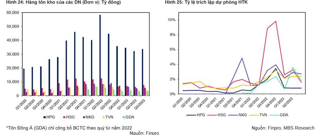 Giá thép thế giới biến động chưa rõ xu hướng khiến các doanh nghiệp có xu hướng quản lý hàng tồn kho thận trọng. Hàng tồn kho tại các doanh nghiệp giảm khoảng trên 25% so với cùng kỳ (giá trị NVL giảm khoảng 20%) trong bối cảnh nhu cầu tiêu thụ ở mức thấp và giá NVL biến động. Giá thép tăng trở lại khiến áp lực trích lập dự phòng giảm khoảng 35% so với cùng kỳ.