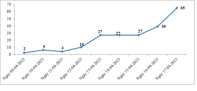 Cụ thể: Trong ngày 17/4/2023 số ca mắc tiếp tục tăng cao, ghi nhận 65 trường hợp mắc mới, tăng 26 ca so với ngày 16/4/2023 (39 ca), trong đó địa phương có số ca mắc tập trung nhiều là TP Hải Dương (17 ca), TP Chí Linh (9 ca) và TX Kinh Môn (9 ca). Có 22 bệnh nhân điều trị tại bệnh viện các tuyến, 02 bệnh nhân điều trị tại TTYT huyện và 41 bệnh nhận điều trị tại nhà.