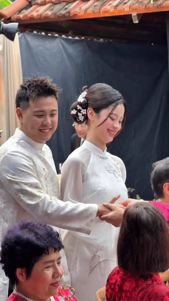 Visual Hàn Hằng một lần nữa thu hút sự chú ý của netizen. Cô dâu búi tóc cài hoa, chọn tone makeup trong trẻo. Đặc biệt hot girl Thanh Hóa vô cùng tươi tắn khi xuất hiện bên chồng.