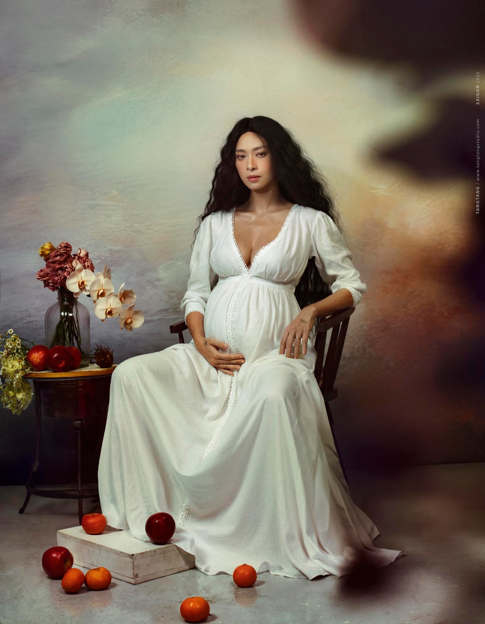 Còn trong bộ ảnh mới, cô diện đầm trắng xẻ cổ sâu theo phong cách châu Âu thời xưa. Ngô Thanh Vân ngồi nhẹ nhàng bên những nhành hoa và trái cây biểu tượng cho sự sống, khoe bụng bầu rõ nét. Dù đang trong giai đoạn thai kỳ cuối, gương mặt của cô vẫn giữ được thần thái mạnh mẽ, ánh mắt kiêu hãnh nhưng đầy dịu dàng – gợi nhớ hình ảnh “người mẹ bất tử” trong bộ phim The Old Guard 2 mà cô đóng.